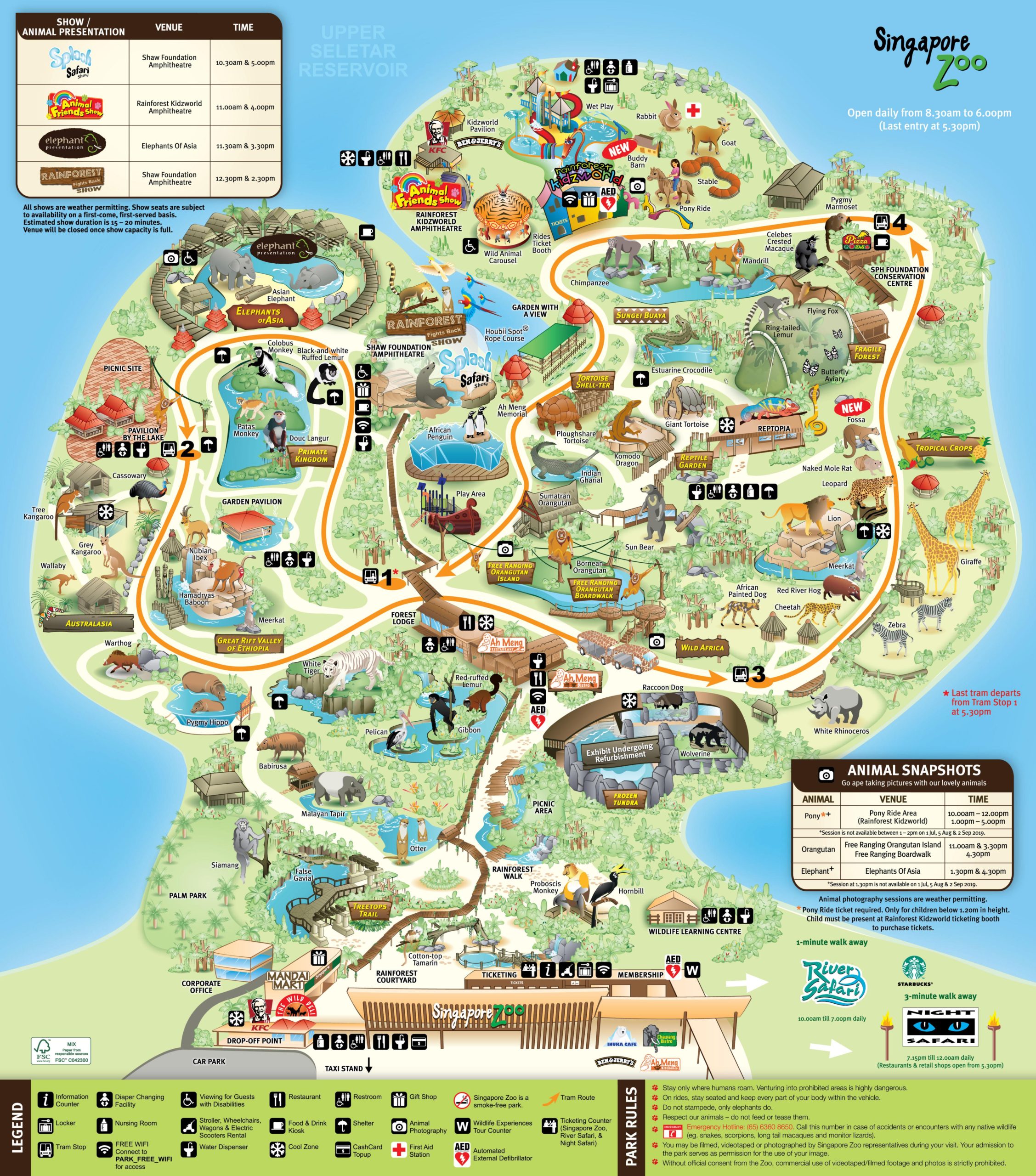 Zoo mají v Singapuru v podstatě rozdělenou na čtyři části – na jakousi „všeobecnou“ zoo, na River Safari (kde jsou převážně vodní živočichové a pavilon pand), na Night Safari (kde si mohou návštěvníci prohlédnout vybraná zvířata v noci) a na Jurong Bird Park (ptačí rezervace, nachází se však v jiné části Singapuru).